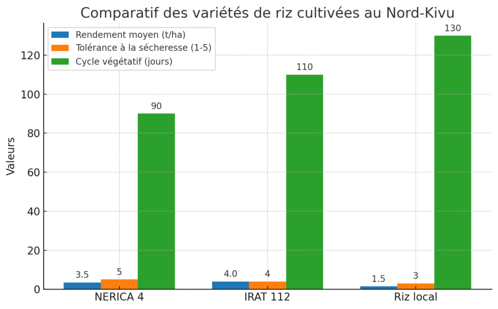 Ce graphique illustre les différences entre les variétés NERICA 4, IRAT 112 et le riz local en termes de rendement moyen, de tolérance à la sécheresse (échelle 1-5) et de durée du cycle végétatif (en jours). On observe que l’IRAT 112 affiche le rendement le plus élevé, tandis que le NERICA 4 présente la meilleure tolérance à la sécheresse et un cycle plus court, ce qui le rend adapté aux zones sujettes à des périodes sèches. Le riz local, bien que très adapté au terroir, reste en retrait sur le rendement et la résistance à la sécheresse.