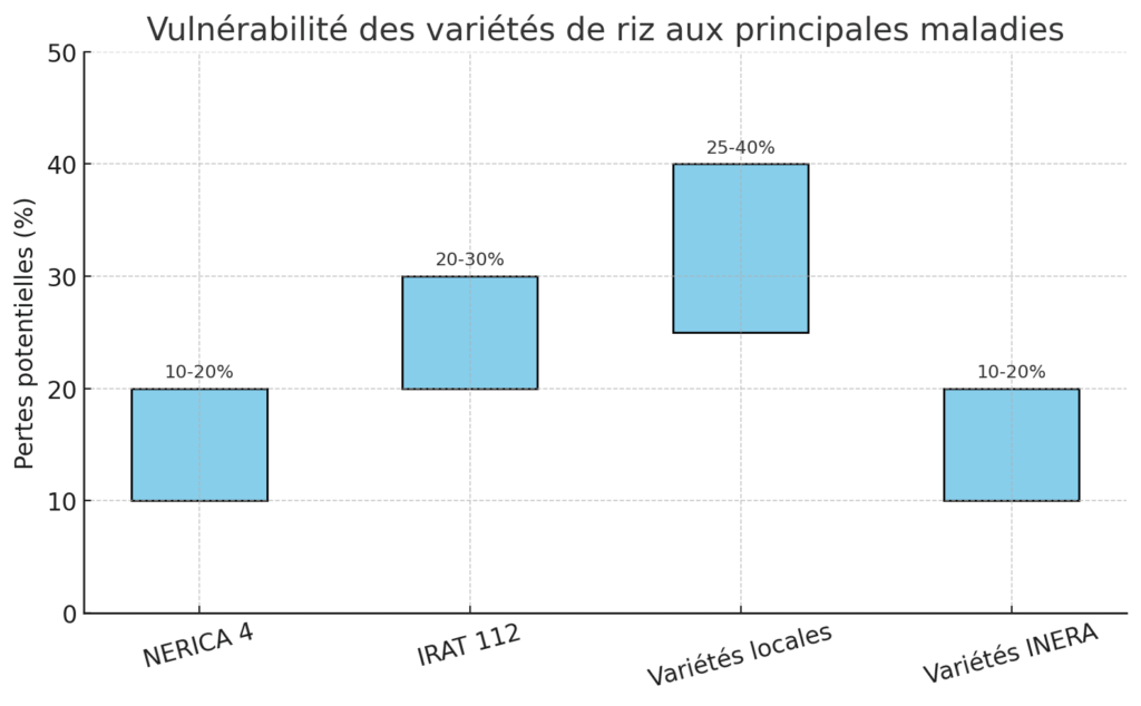 Les données mettent en évidence l’intérêt des programmes de sélection variétale pour renforcer la résilience face aux maladies comme la pyriculariose, la bactériose ou la fusariose. Les variétés améliorées, mieux adaptées aux conditions locales, permettent de réduire sensiblement les pertes, contribuant ainsi à la sécurité alimentaire des producteurs.