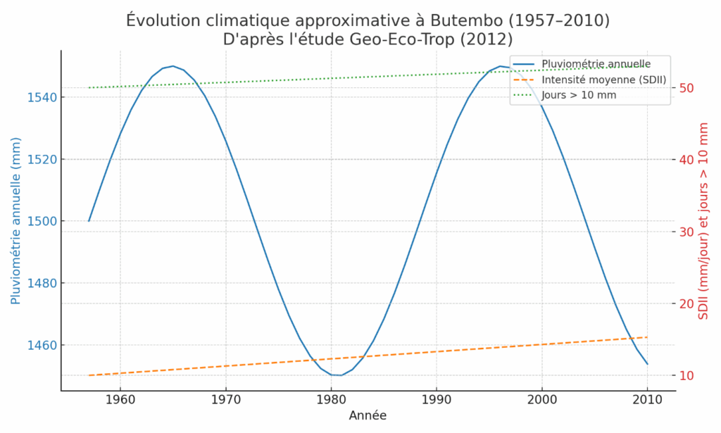 Ce graphique généré par GPT retrace l’évolution des pluies à Butembo (1957-2010), d’après des données parues dans la revue Geo-Eco-Trop (2012). La pluviométrie annuelle (ligne bleue) reste proche de 1 500 mm, mais l’intensité moyenne des jours pluvieux (pointillés orange) progresse légèrement (+0,1 mm/jour) et les jours avec plus de 10 mm de pluie (pointillés verts) augmentent d’environ trois par an. Résultat : plus d’averses violentes, accentuant les risques d’inondation et d’érosion.