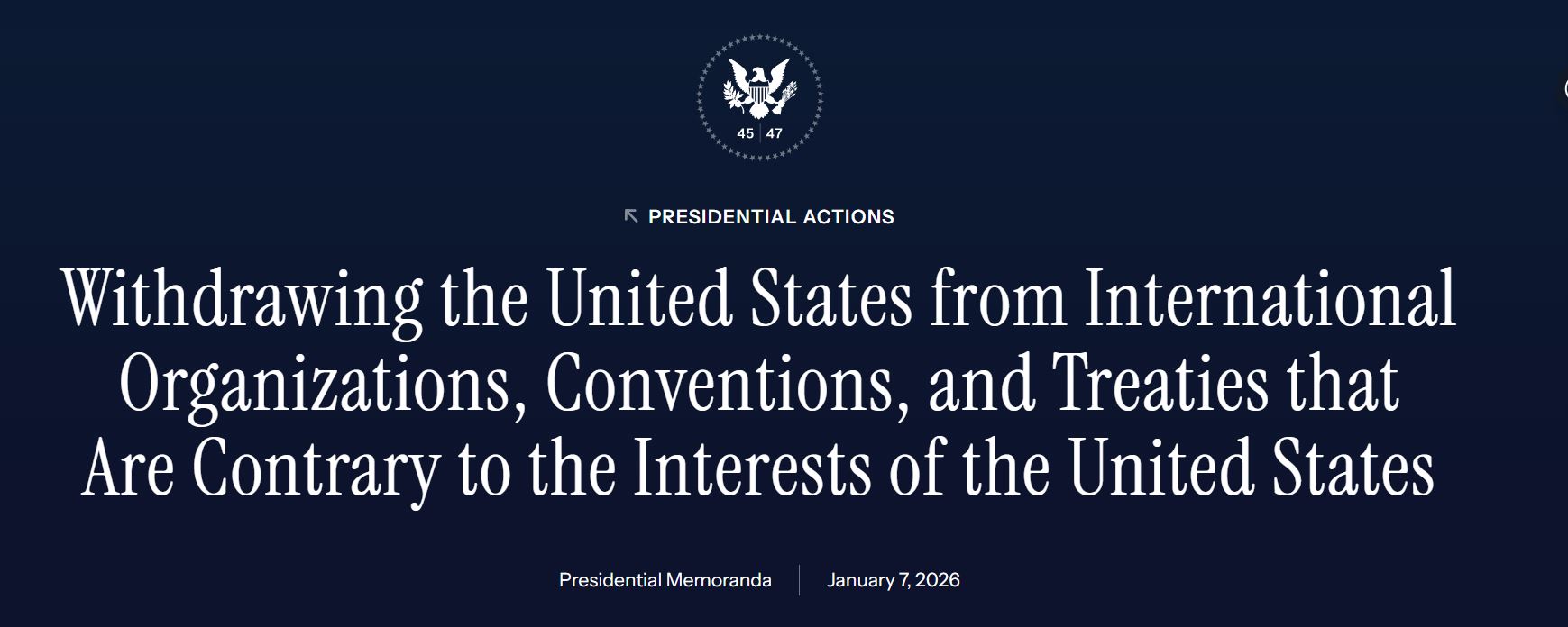Le 7 janvier 2026, la Maison-Blanche a officialisé une décision lourde de conséquences : les États-Unis se retirent de 66 organisations, conventions et mécanismes internationaux jugés « contraires aux intérêts américains ». Parmi les structures concernées figurent des piliers de la gouvernance mondiale de l’environnement, du climat et du développement humain, notamment l’Union internationale pour la conservation de la nature (UICN) et le programme UN-REDD, mais aussi des cadres liés au climat, à la santé reproductive, à l’éducation en situation d’urgence ou à la consolidation de la paix.