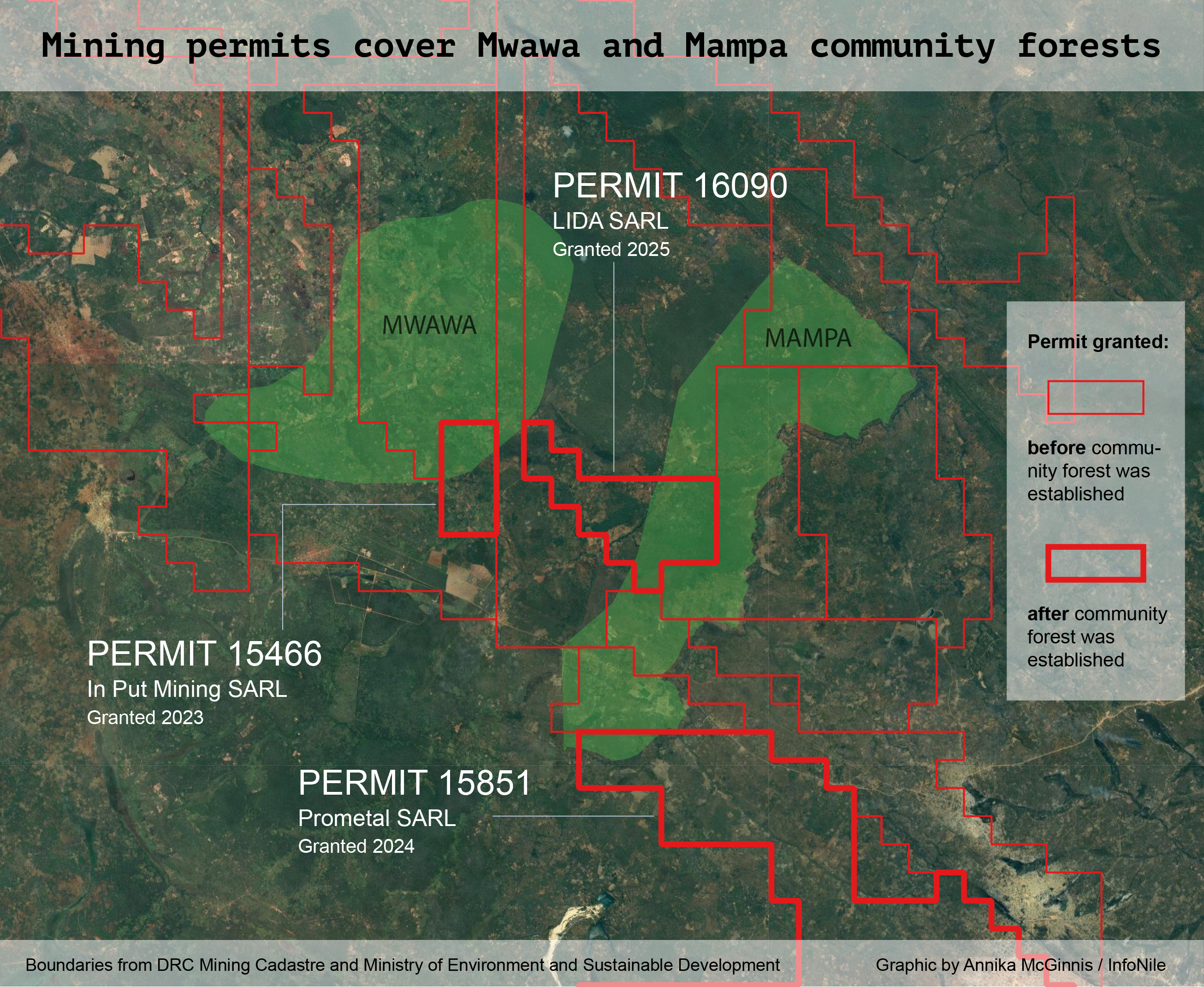 Dans le village voisin de Mampa, neuf permis miniers couvrent la forêt communautaire. Cela inclut au moins deux permis de cinq ans délivrés après la création de cette forêt en 2021 : celui de Prometal SARL, accordé en juin 2024, et celui de LIDA SARL, qui chevauche également Mwawa.